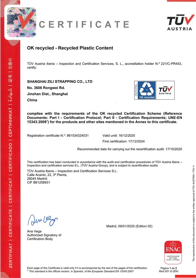 近日,自立科技正式获得由国际独立第三方机构TÜV奥地利颁发的EN 15343欧洲再生塑料标准认证(含UNE EN 15343)。这项认证使自立科技成为国内首家获得此认证的PET打包带生产企业,并标志着公司在塑料回收再利用领域的卓越表现与可追溯性管理达到了国际标准,进一步提升了自立科技在全球市场的竞争力。